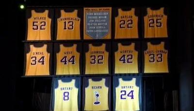 湖人队史至今共有11人享受到退役球衣待遇,除了科比的8号和24号球衣,以及传奇解说员赫恩带有麦克风标志的纪念球衣,还有九大巨星的球衣得到退役。他们分别是效力湖人8个赛季,00一02年三连冠核心球员大鲨鱼奥尼尔(34号),职业生涯13年全部效力湖人,史上最伟大的控卫,为球队夺得5次总冠军的魔术师约翰逊(32号),效力湖人14个赛季,为球队夺得5次总冠军的历史得分王天勾贾巴尔(33号),14年生涯全部效力湖人,带领球队9次杀入总决赛并夺得1次冠军的杰里韦斯特(44号),生涯14年全部效力湖人,8次杀入总决赛的无冕之王贝勒爷(22号),效力湖人5个赛季夺得1次总冠军,创下NBA无数纪录的大帅张伯伦(13号),效力湖人9年,71一72年两连冠核心之一古德里奇(25号),生涯12年全部效力湖人,3夺总冠军的詹姆斯沃西(42号),以及效力湖人8年,3夺总冠军的威尔金斯(52号)。