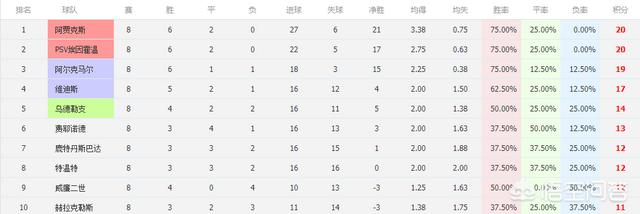 阿贾克斯8轮荷甲之后6胜2平积20分排名第1位,与宿敌埃因霍温并列,因净胜球优势排名榜首。进球27个,排名第1位,失球6个,排在第3位。