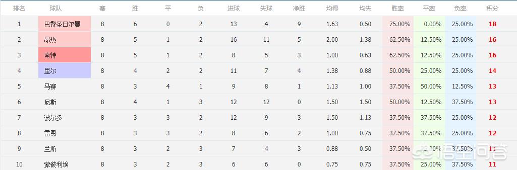 大巴黎目前领跑法甲,8轮过后,6胜2负积18分,领先第2名2分,优势并不明显。进13球失4球,进球数排在第4位,失球数并列第1位。