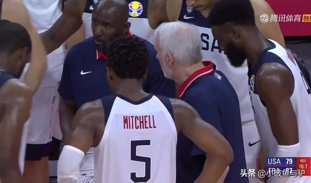 美国队败局已定的情况下,在16.7秒的时候还是叫了个暂停布置了战术,美国队全体14名球员都在围在一起聆听现老鹰队主教练,此次美国队助理教练皮尔斯的战术布置,就连美国队主教练波波维奇都在边上看着。