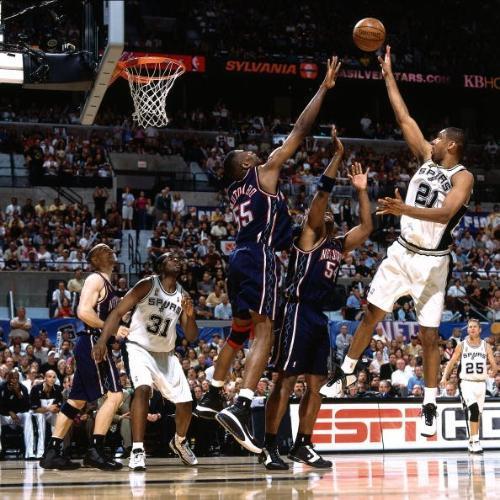 二、2003年,邓肯带领马刺夺冠。这一年,马刺虽在上将、帕克、马努等球员,但彼时的上将已是廉颇老矣,赛季结束即退役的老将,帕克马努更是联盟菜鸟,邓肯像前辈奥拉朱旺一样,统治得分,篮板,盖帽,助攻四项数据,拿下24.2分,17板,5.3助攻,5.3盖帽的数据,战胜拥有基德、马丁的篮网,夺得总冠军。更旷绝古今总决赛准四双表演,让同为状元的马丁看起来像一个菜鸟,毫无招架之功。