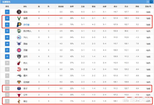 东部排名如下图,这其中雄鹿、步行者、奇才、骑士的排名让人出乎意料。