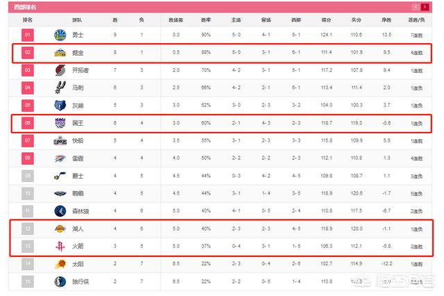 西部排名如下图,这其中个人认为战绩出乎意料的应该是掘金、国王、火箭、湖人4支球队。