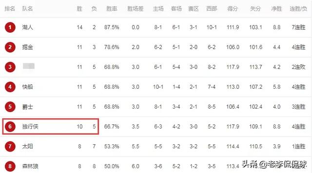 目前豪取四连胜的独行侠以10胜5负的战绩暂居西部第六,落后第一的湖人3.5个胜场,落后第二的掘金也只有1.5个胜场。不夸张的说,独行侠是开赛至今西部表现最让人惊讶的球队,甚至没有之一,之前表现同样出色的森林狼和太阳在近期则出现了掉队的趋势。