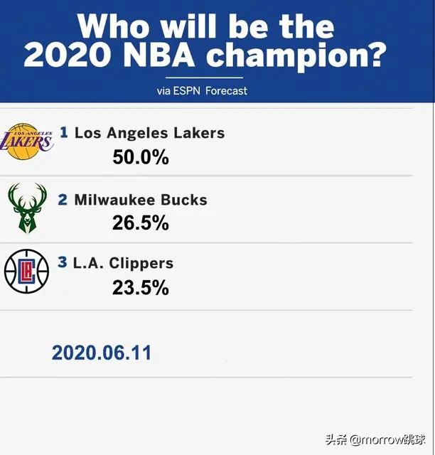 那么这赛季,那几支球队是有夺冠机会的呢?很明显,湖人、快船和雄鹿是最有机会的三支球队,这是ESPN预测的夺冠概率前三名。