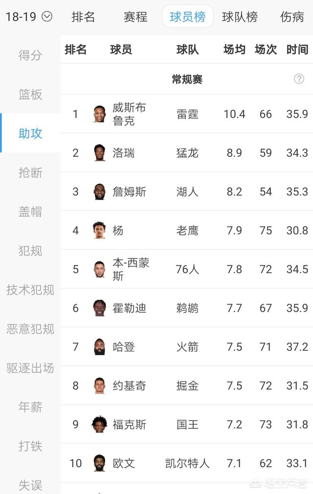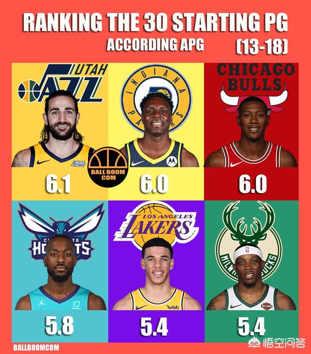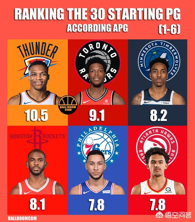 NBA30位首发控卫场均助攻1-6名:拉塞尔·威斯布鲁克(10.5)、凯尔·洛瑞(9.1)、杰夫·蒂格(8.2)、克里斯·保罗(8.1)、本·西蒙斯(7.8)、特雷·杨(7.8)