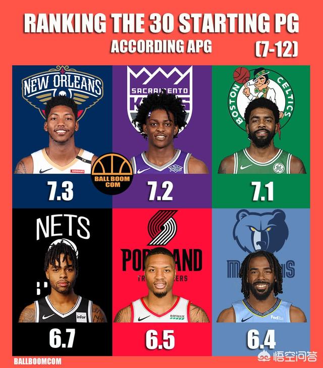 NBA30位首发控卫场均助攻7-12名:艾弗里·佩顿(7.3)、达龙·福克斯(7.2)、凯里·欧文(7.1)、安吉洛·拉塞尔(6.7)、达米安·利拉德(6.5)、迈克·康利(6.4)