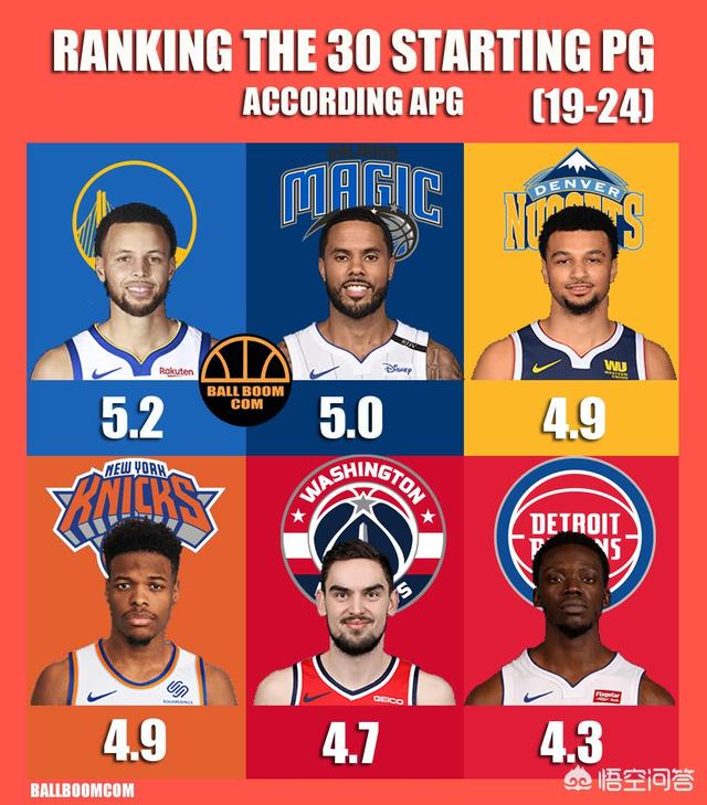 NBA30位首发控卫场均助攻19-24名:斯蒂芬·库里(5.2)、DJ.奥古斯丁(5.0)、贾马尔·穆雷(4.9)、小丹尼斯·史密斯(4.9)、托马什·萨托兰斯基(4.7)、雷吉·杰克逊(4.3)