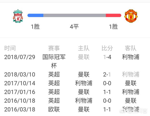 先看看双方近6次交手的战绩吧!利物浦1胜4平1负,双方势均力敌,但是今年7月29日的最近一次交手中利物浦4:1客场大胜曼联。